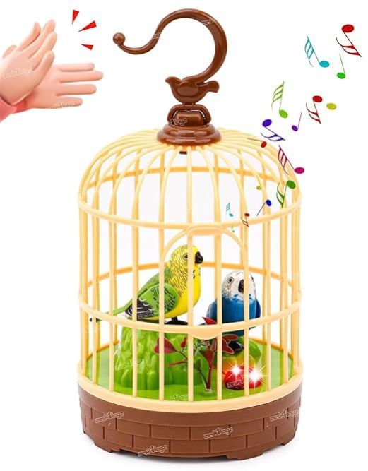 Battery operated chirping bird in cage. Clap your hands and the bird magically comes alive as it moves around and makes chirping sounds
