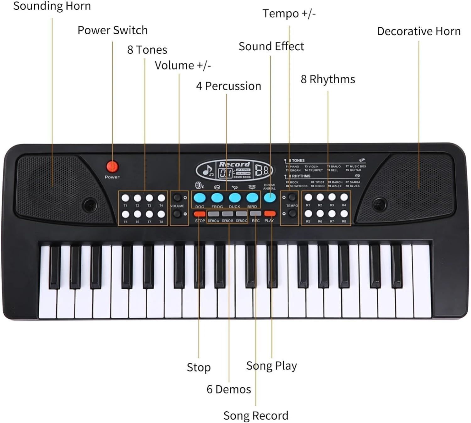 Features : 37 keys, 8 tones, 8 rhythms, MP3 function, 6 demos, volume control, Tempo control, song recorder, song play.